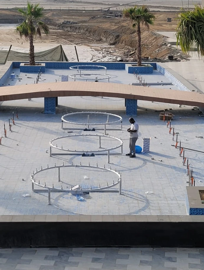 الأنظمة والمعدات: تركيب شبكة متطورة من المواسير والنافورات المصنعة من مواد مقاومة للصدأ والتآكل لضمان استدامة التشغيل تحت مختلف الظروف المناخية.