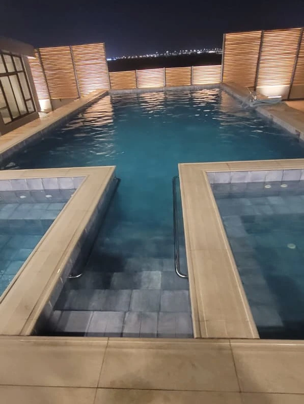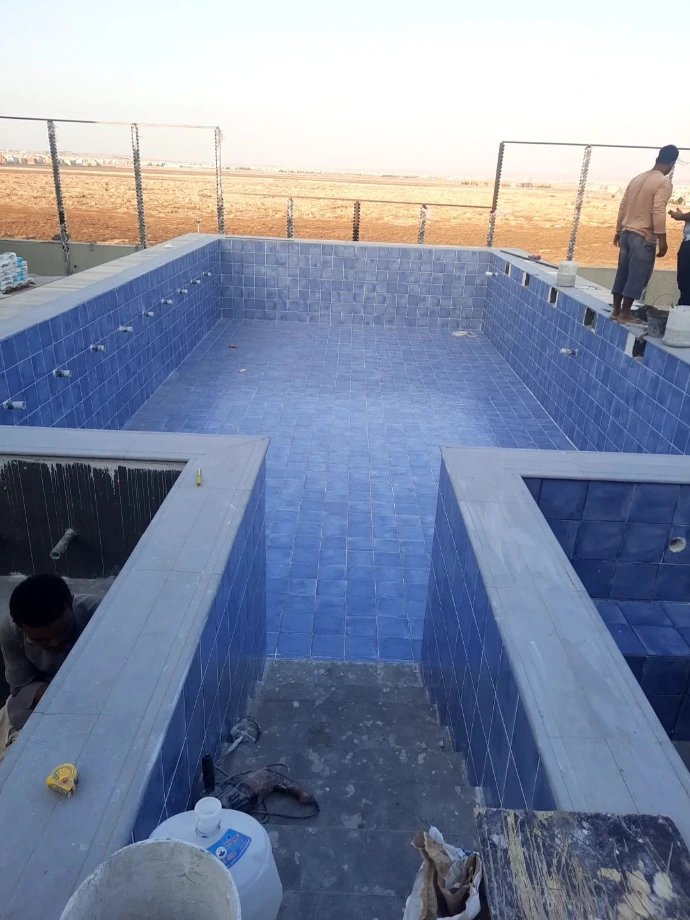 التشطيب النهائي: استخدام سيراميك مسابح فاخر باللون الأزرق الكريستالي، مع تنفيذ عزل مائي متكامل لضمان استدامة المشروع.