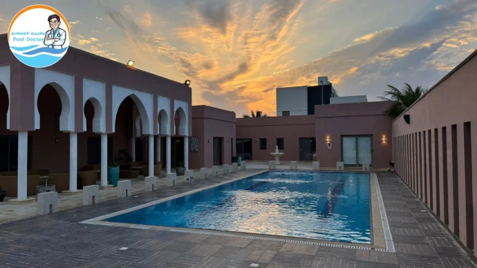 خزان التوازن (Balance Tank): تم بناء خزان توازن مخفي تحت الأرض بسعة تتناسب مع حجم المسبح، لضمان استمرارية دوران المياه ونقائها الدائم.